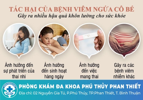 Gây ra các bệnh viêm nhiễm khác: Viêm âm đạo nếu không kịp thời điều trị dễ dẫn đến các bệnh viêm nhiễm khác như: viêm đường tiết niệu, viêm vùng chậu, viêm niêm mạc tử cung. Bên cạnh đó, khi da hoặc niêm mạc trực tiếp hoặc gián tiếp tiếp xúc với mầm bệnh dễ lây nhiễm các bệnh lây truyền qua đường tình dục như: mụn rộp sinh dục, bệnh lậu, giang mai, nấm…